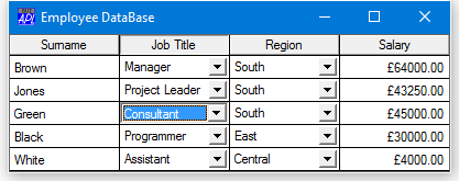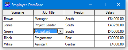 The following Grid uses two internal Combo objects for the Job Title and Region columns, but with ShowInput set to 0. Only the current cell has Combo appearance.
