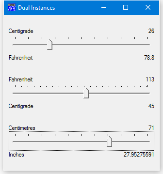 creates a Form and 3 Instances of Dual; one to convert Centigrade to Fahrenheit, one to convert Fahrenheit to Centigrade, and the third to convert centimetres to inches.