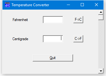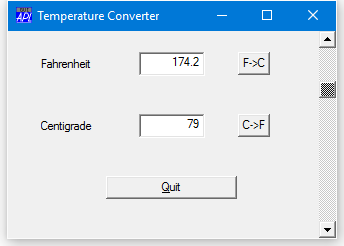 The range of a scrollbar goes from 1 to the value of the Range property. Setting Range to 101 will give us a range of 1-101. You will see in a moment why we need to do this. The Scroll event will be generated whenever the user moves the scrollbar. We have associated it with the callback function 'C2F'