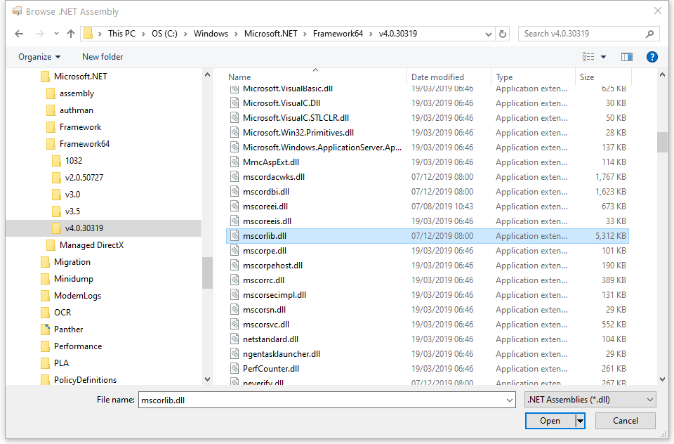 This brings up the Browse .NET Assembly dialog box as shown below. Navigate to the .NET assembly of your choice, and click Open.