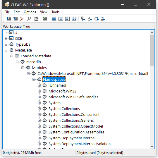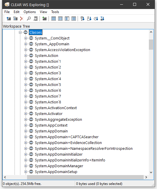 Opening the System/ Classes sub-folder causes the Explorer to display the list of classes contained in the .NET Namespace System as shown in the picture below.