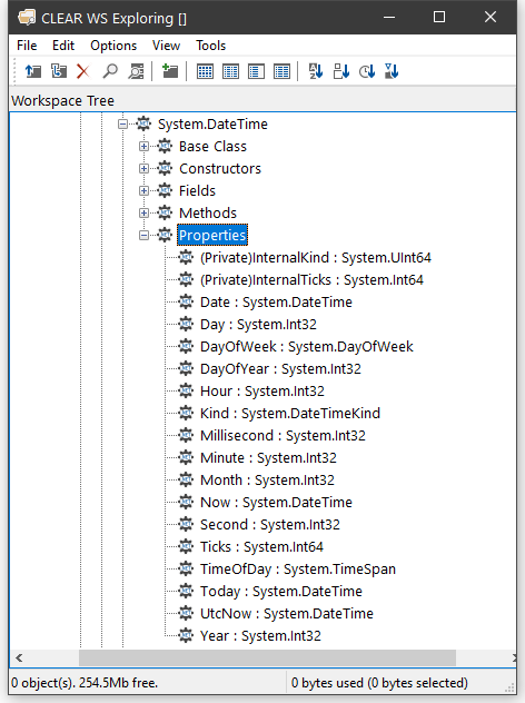 The Properties folder provides a list of the properties supported by the Class. It shows the name of the property followed by its data type. For example, the DayOfYear