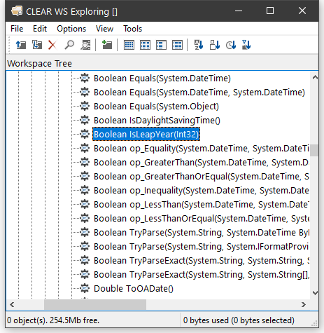 The Methods folder lists the methods supported by the Class. The Explorer shows the data type of the result of the method, followed by the name of the method and the types of its arguments. For example, the IsLeapYear
