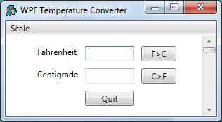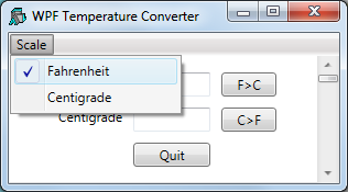 The above extract from the XAML defines a Menu. Setting Dock to "Top" causes the Menu as a whole to be docked, so that it appears like a menubar, along the top of the DockPanel. The Menu contains a single MenuItem labelled Scale which itself contains two sub-items labelled Fahrenheit and Centigrade respectively. The IsCheckable property specifies whether or not the user can check the MenuItem, and the IsChecked property sets and reports its checked state. The underscore characters (for example, as in "_Scale") identify the following character as a keyboard shortcut.