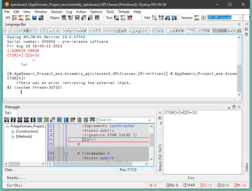 … as we have built the Dyalog .NET class to use the Development DLL, the APL Session appears, and the Tracer can be used to debug the problem. You can see that the constructor CTOR