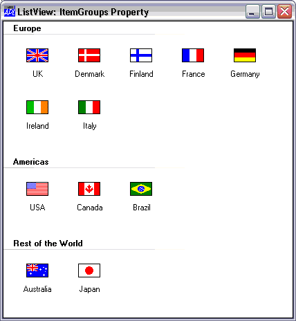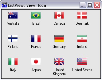 The Items property is a vector of character vectors that specifies the labels for the items displayed by the ListView. The ImageListObj property specifies the names of two ImageList objects that define two sets of icons; a large icon (32x32 pixel) set and a small icon (16x16 pixel) set. Alternatively, ImageListObj may be empty (no icons displayed) or contain just the name of a single large icon ImageList.