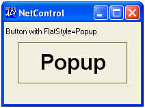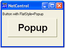 The following example illustrates the use of the Button class. In this case, the FlatStyle property of the button is set to "Popup". This gives the button a flat appearance until the mouse is hovered over it, when its appearance it changes to 3-dimensional.