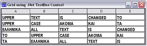 In most cases, you may use a NetControl in the cells of a Grid object. Unless you specify otherwise, using the InputProperties property of the Grid, the default property of the NetControl will be associated with the corresponding element of Values. The following example illustrates the use of a TextBox control. In this example, the CharacterCasing property of the TextBox is set to Upper, causing all text to be converted to upper-case.