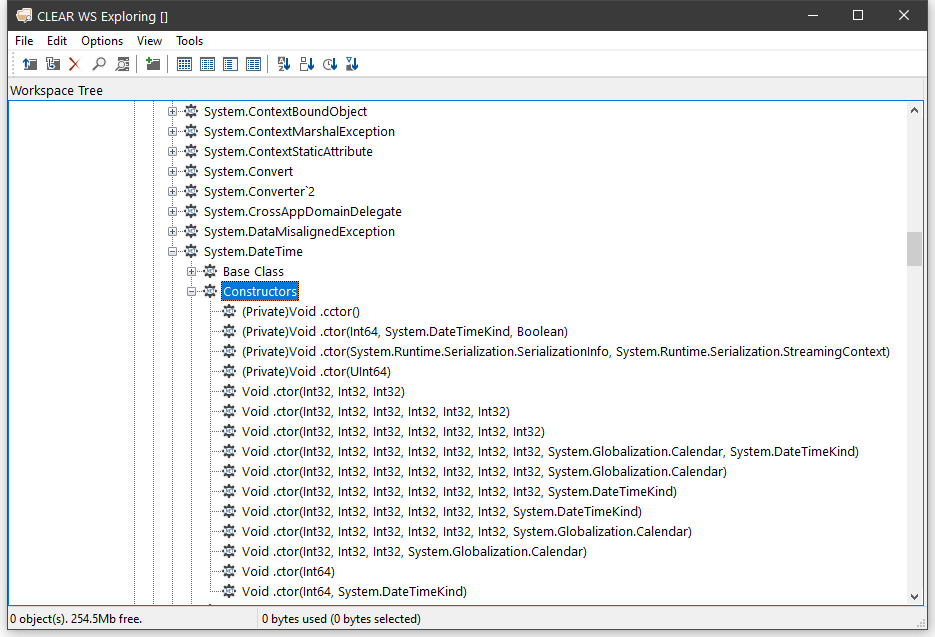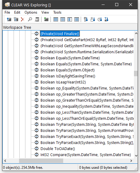 Opening the System/ Classes sub-folder causes the Explorer to display the list of classes contained in the .NET Namespace System as shown in the picture below.