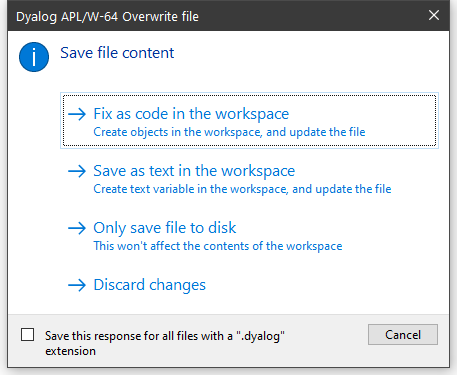 Note that if you choose Fix as code in the workspace or Save as text in the workspace, information about the file and the text variable associated with it is retained in the workspace. This information may be obtained using 5176⌶