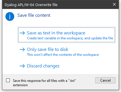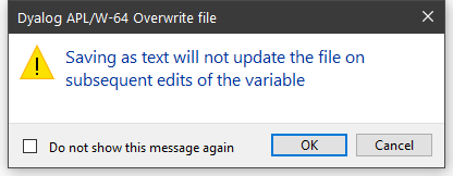 If you choose this option, the file will be updated and the contents of the file will also be saved to a variable in the workspace. First you will see the following warning dialog, which may be disabled subsequently by checking Do not ask this question again.