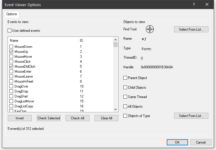 The Event Viewer Options dialog box allows you to select the objects and events that you wish to monitor.