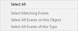 Select Matching Events | Highlights all the events that have the same Object and Event Name (or Event Number) as the currently selected event. |