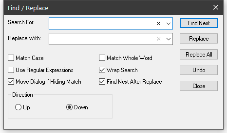 Find and Replace work on the concept of a current search string and a current replace string which are entered using the Find and Find/Replace Dialog boxes. These boxes also contain buttons for performing search/replace operations.