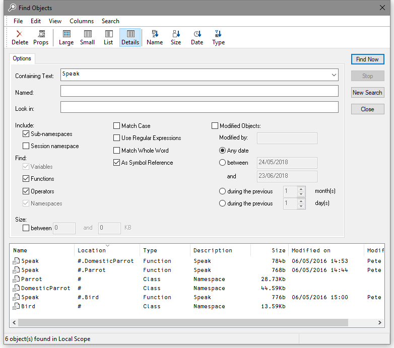 When you press the Find Now button, the system searches for objects that satisfy all of the criteria that you have specified on all 3 pages of the dialog box and displays them in a ListView. The example below illustrates the result of searching the workspace for all objects containing references to the symbol Speak