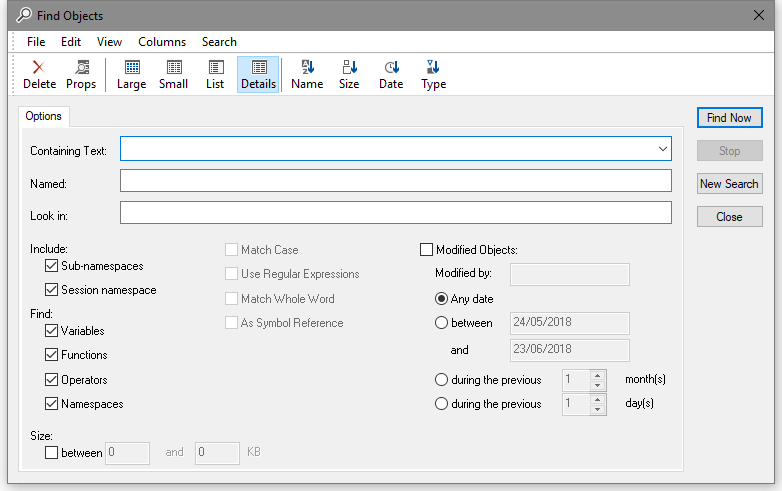 If you wish to restrict the search to find only objects whose size is within a given range, check the box labelled Size is between and enter values into the fields provided.