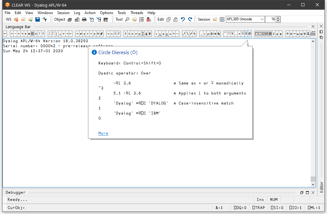 The Language Bar is an optional window which is initially docked to the Session Window, to make it easy to pick APL symbols without using the keyboard.