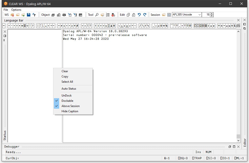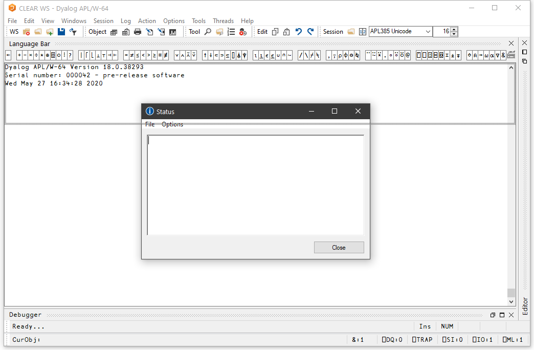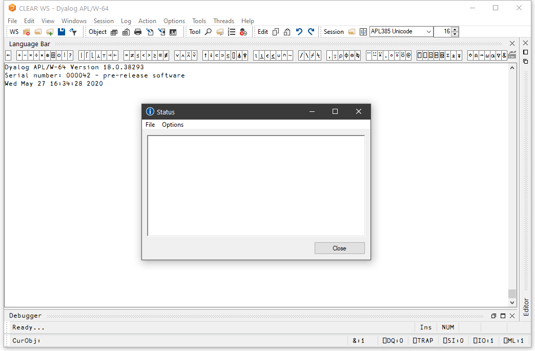 Nearly all of the windows used in the Dyalog IDE may be docked in the Session window or be stand-alone floating windows. When windows are docked in the Session, the Session window is split into resizable panes, separated by splitters. The following example, using the Status window, illustrates the principles involved. (The use of the Status window is described later in this Chapter.)
