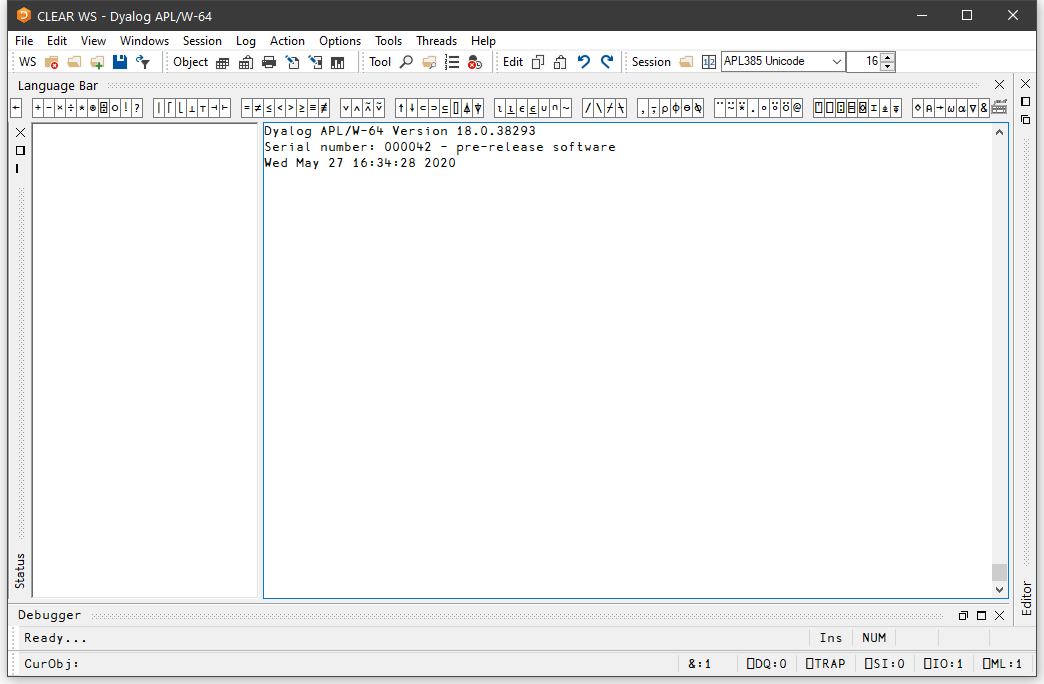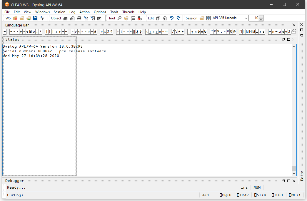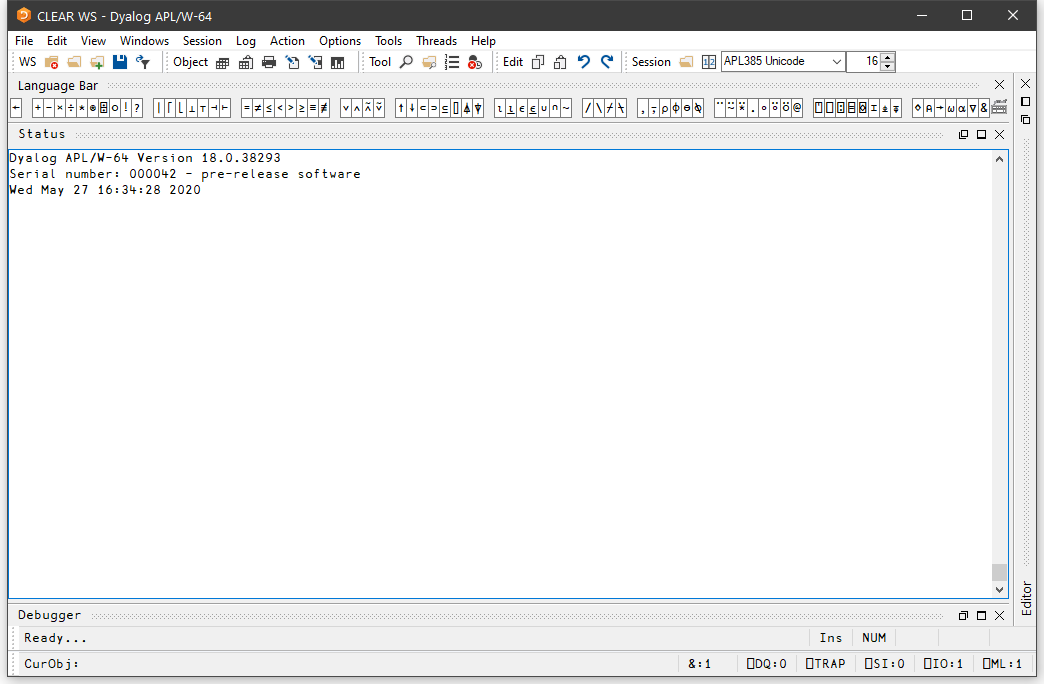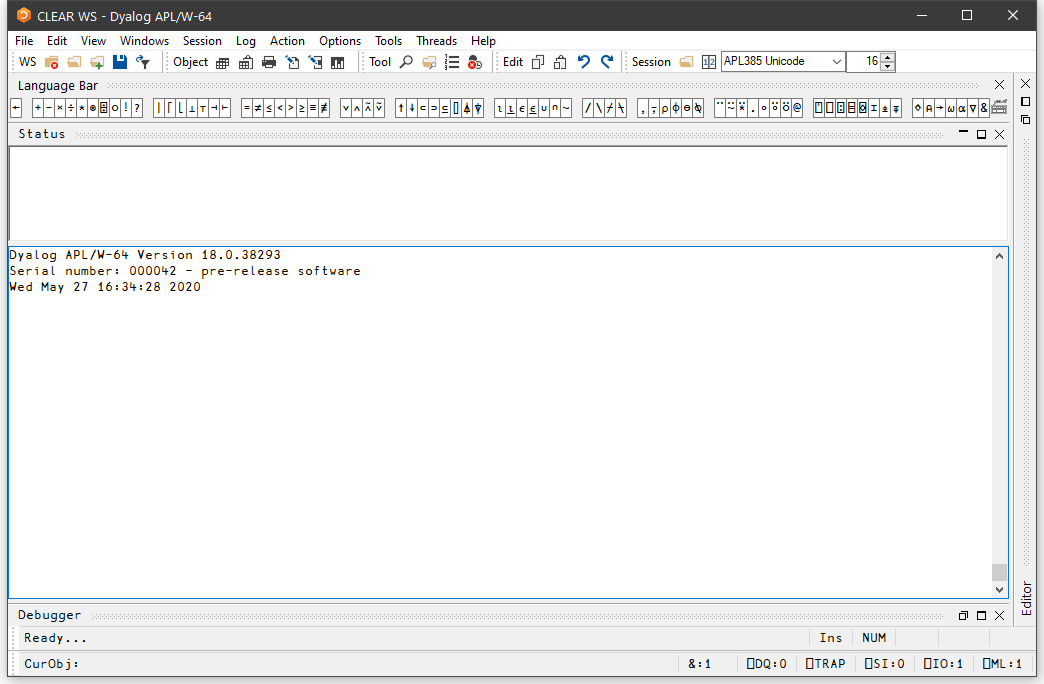 The primary purpose of the session window is to provide a scrolling area within which you may enter APL expressions and view results. This area is described as the session log. Normally, the session window will have a menu bar at the top with a tool bar below it. At the bottom of the session window is a status bar. However, these components of the session may be extensively customised and, although this chapter describes a typical session layout, your own session may look distinctly different. A typical Session is illustrated below.