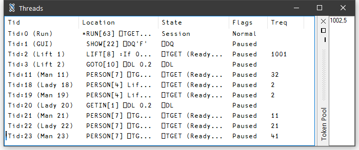 Auto Refresh | Selecting this item causes the Threads Tool to be updated continuously, so that it shows the latest position and state of each thread. |