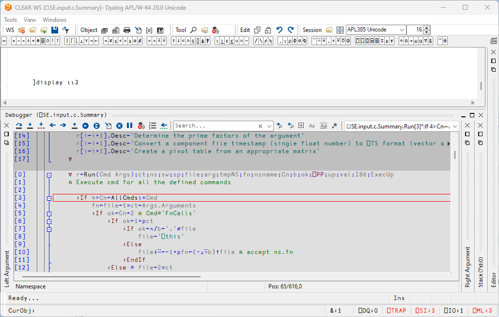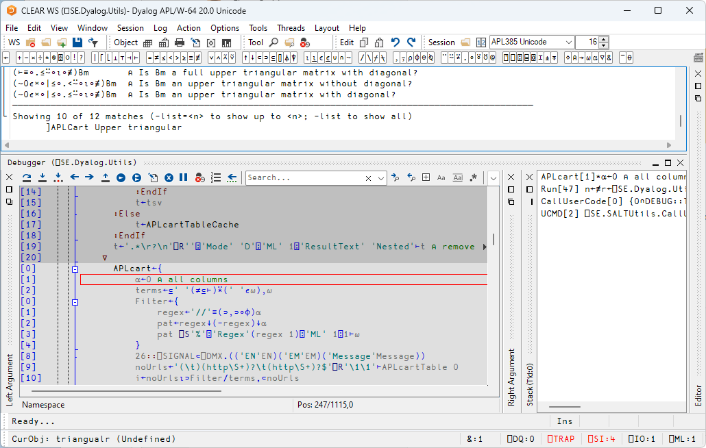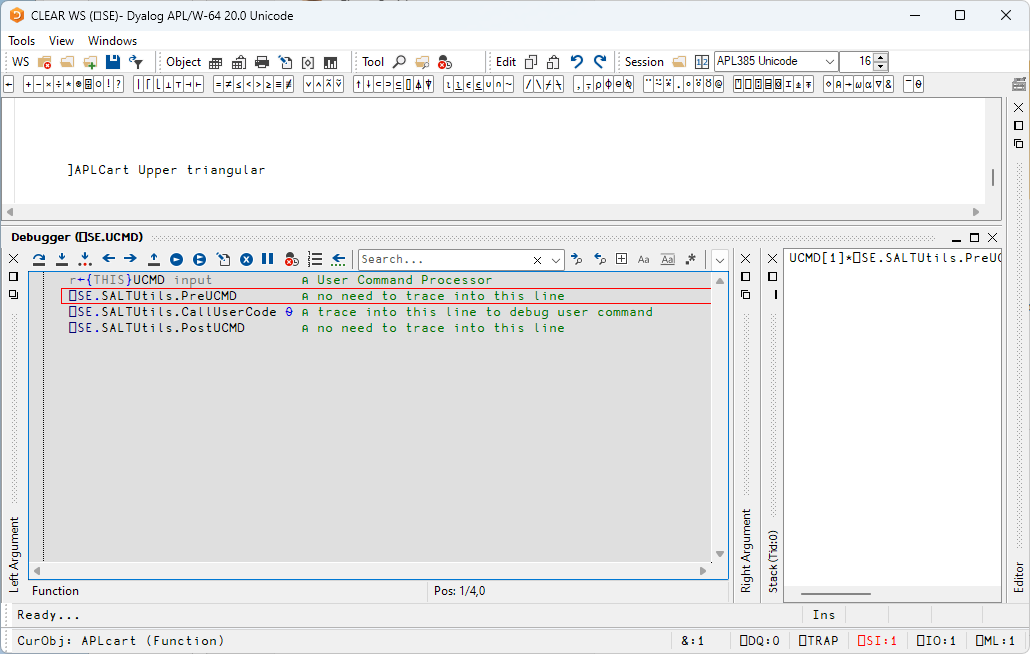 The next illustration shows the result of clicking Trace at this point. This caused the system to trace into ⎕SE.Dyalog.APLCart
