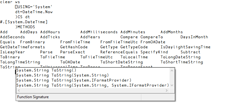 Should the external function provide more than one signature, they are all shown in the Value Tip as illustrated below. Here the function ToString