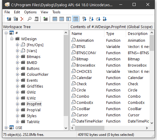 If you open the Fns/Ops item, the names of the functions and operators in the namespace are displayed below it alphabetically in the left (tree view) pane. When you select one of these names, the function itself is opened in the right (list view) pane.